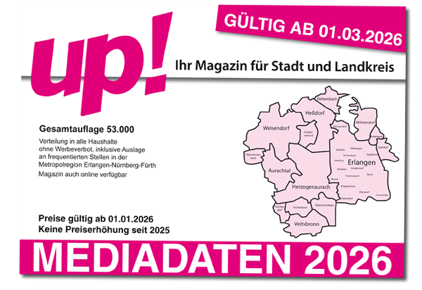 UP! erscheint im Stadtgebiet Erlangen mit allen Ortsteilen, im Landkreis Erlangen- Höchstadt sowie im Landkreis Fürth im Herzen der Metropolregion Nürnberg in einer Auflage von 53.000 Exemplaren.